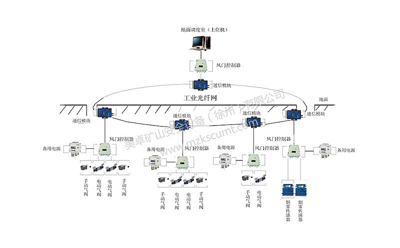 煤礦井下通風(fēng)救災(zāi)系統(tǒng)由上位機(jī)、分站、救災(zāi)門、煙霧傳感器、語言聲光報警器、備用電源等組成。其用于礦井發(fā)生火災(zāi)或其它災(zāi)害時進(jìn)行現(xiàn)場監(jiān)控及救援,以最大限度減少傷亡及損失。