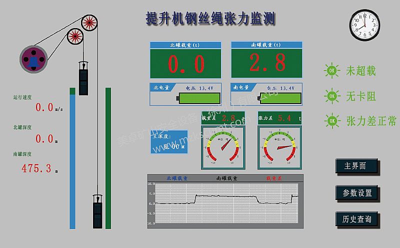 3、容器正常運(yùn)行后,通過行程定位、數(shù)據(jù)采集、智能判斷,可及時(shí)準(zhǔn)確判斷容器在井筒中任何位置狀況(包括容器位置、井筒卡阻、防墜器誤動(dòng)作、松繩等問題)。