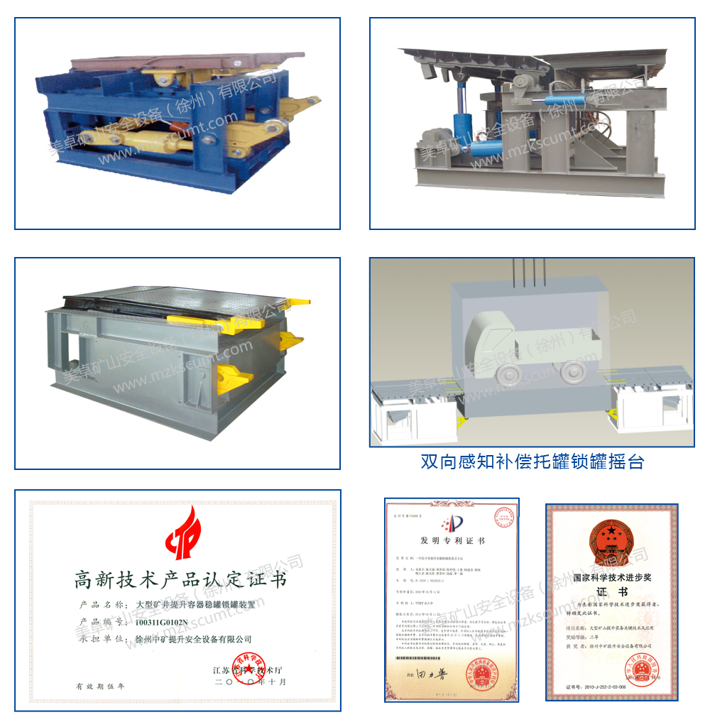該裝置由托罐部分、搭接鎖罐部分、換層機(jī)構(gòu)及托鎖感知部分等組成,徹底解決兩罐籠同時(shí)進(jìn)出車問題。 具有補(bǔ)償提升繩彈塑性伸長、搖臺(tái)回轉(zhuǎn)搭接、罐籠可靠定位、托鎖力實(shí)時(shí)監(jiān)控及自動(dòng)換層功能。當(dāng)容器到位后,托罐部分動(dòng)作,柔性托起罐籠底盤體,同時(shí)搭接鎖罐平臺(tái)動(dòng)作,可靠的鎖住罐籠,防止反彈,實(shí)現(xiàn)罐籠內(nèi)外軌道的無縫搭接,確保礦車進(jìn)出罐籠平穩(wěn)順暢。