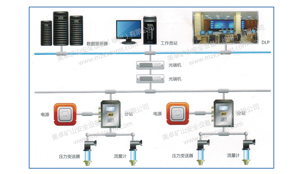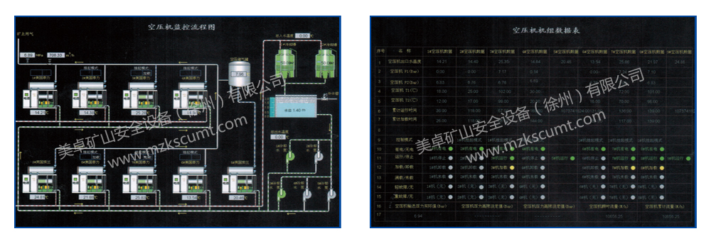 ●顯示功能:在地面集控室由工控機顯示各壓風管路壓力、各供水管路流量。設有各設備的故障信號顯示,并伴有報警。
